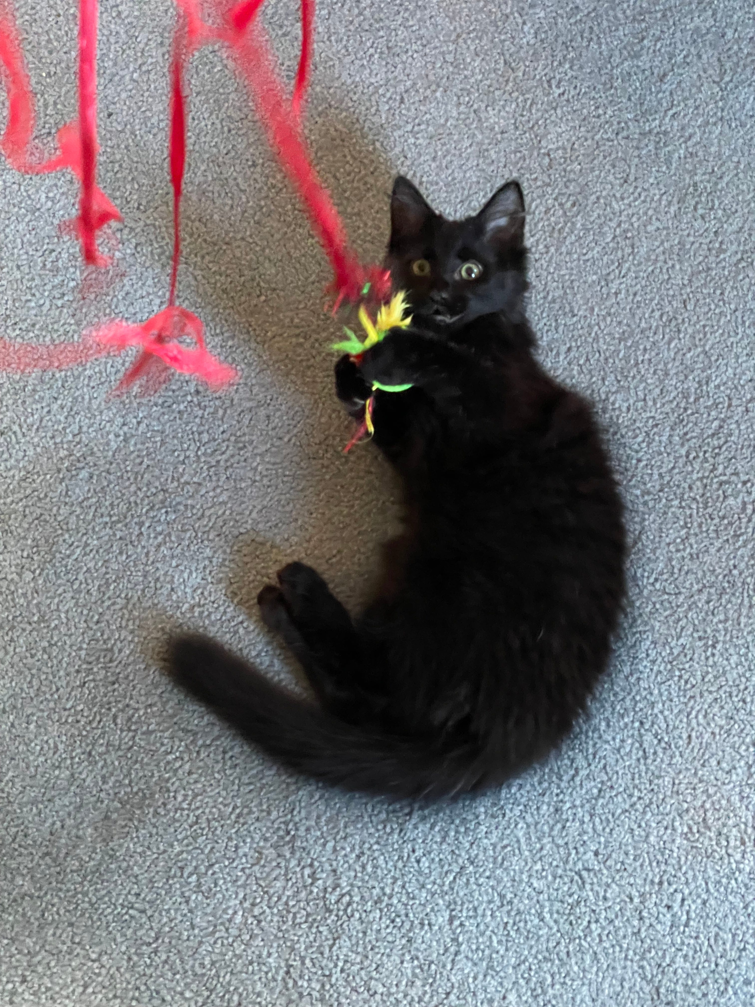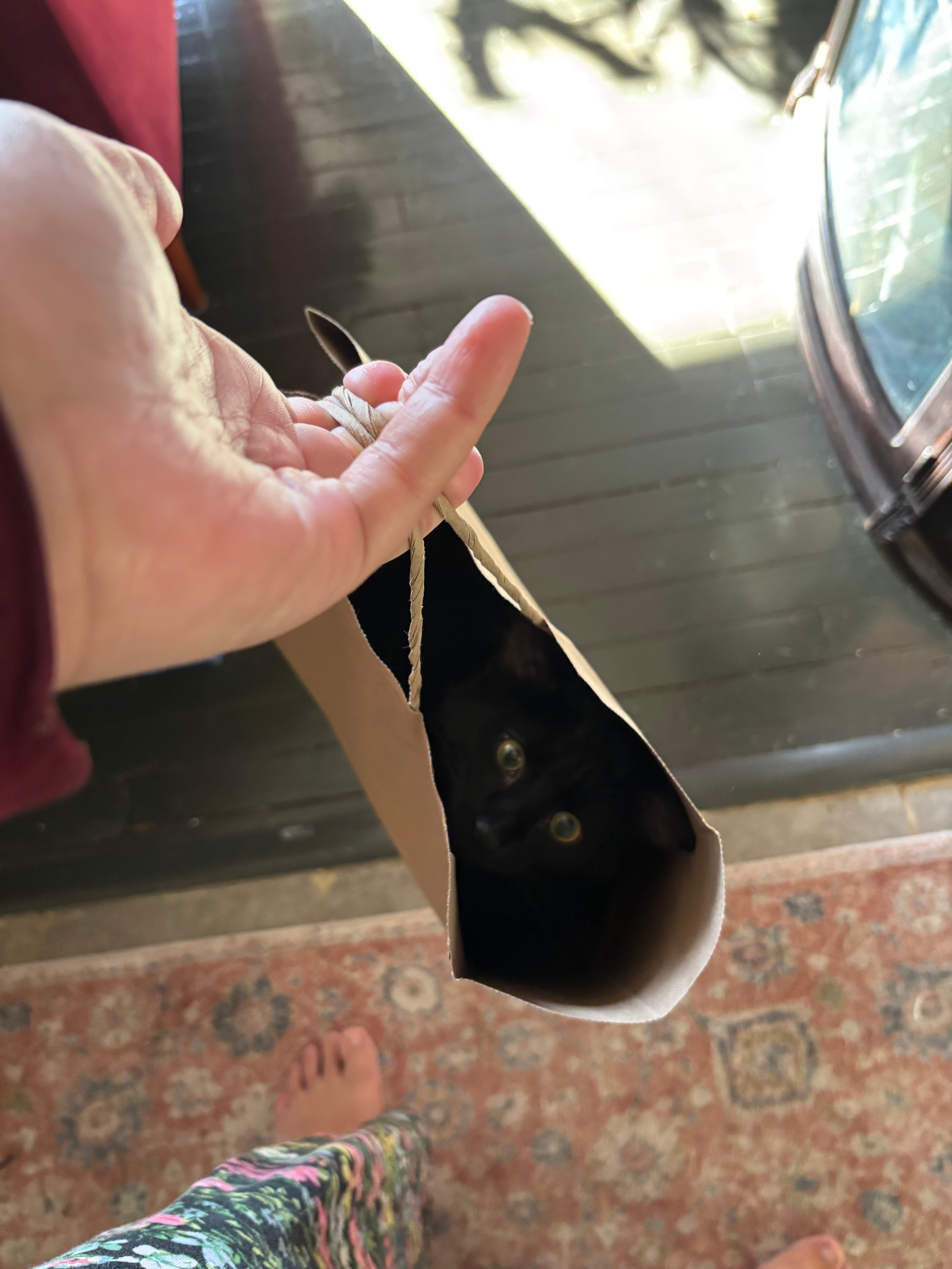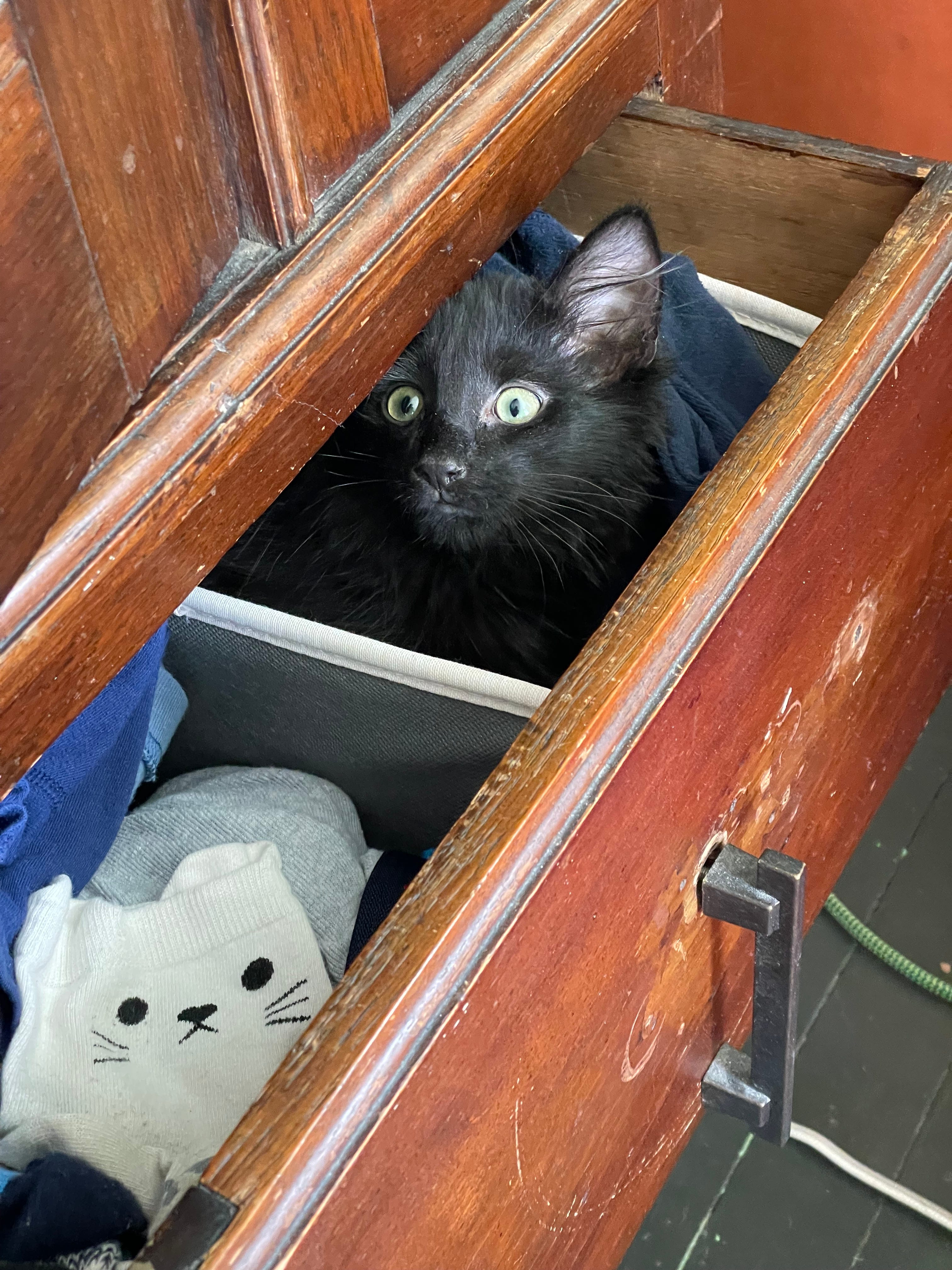 Many people suggested popular black cat names like “Binx,” “Salem,” “Shadow,” and “Void,” but none of these resonated with us or how we see this particular kitten.