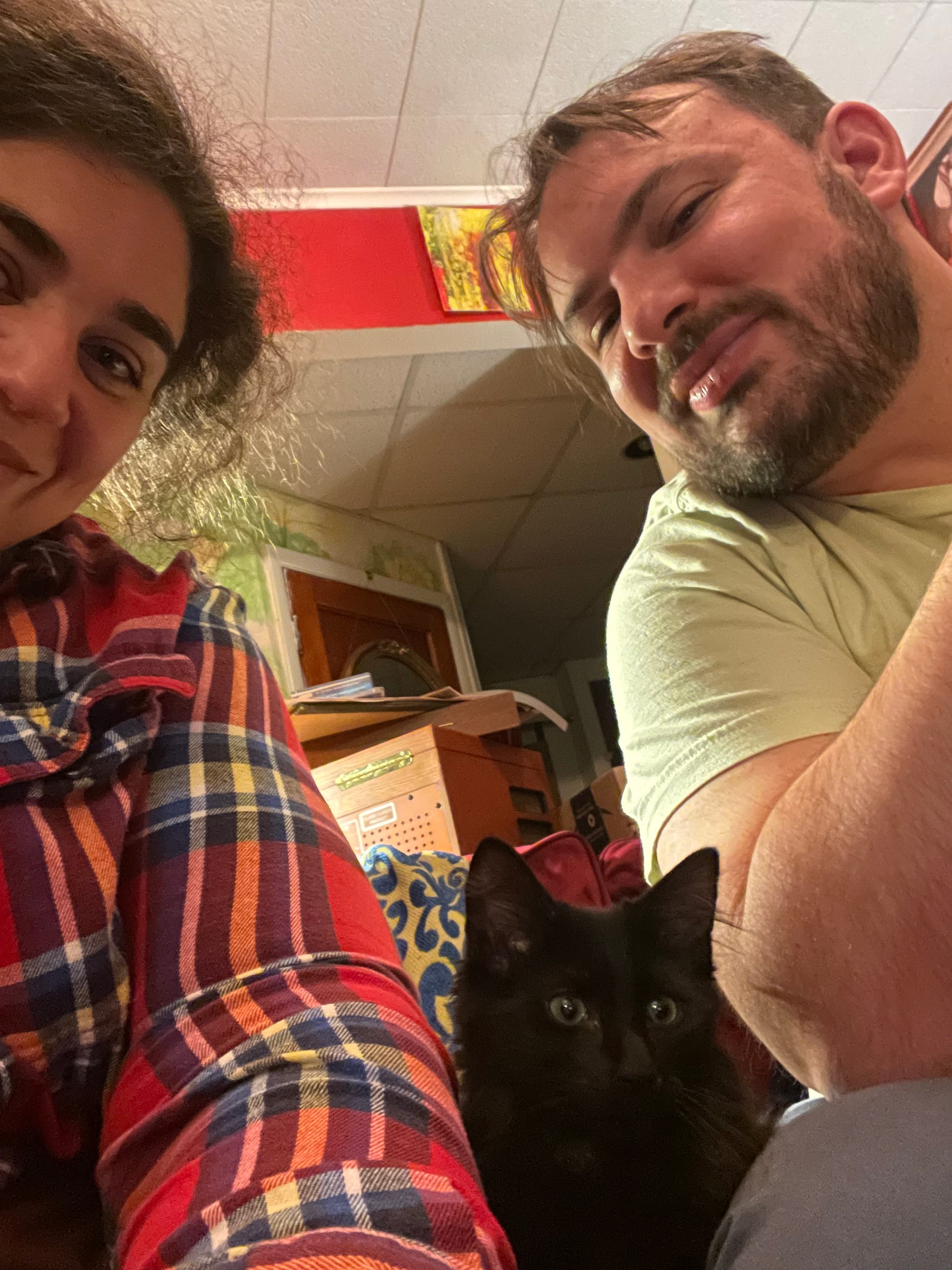 I had gone in open to adopting any of the cats but I was hoping we would like the little black one. I’ve been wanting an all-black cat for years (since long before adopting our beloved late cat, Béla Lugosi, who was a black and white “cow cat”) and I love that he has green eyes! Chris and I happen to both have dark hair and green eyes so I thought it would be funny if we had a cat with similar coloring, like he could be our actual son! His hair is even frizzy like mine!